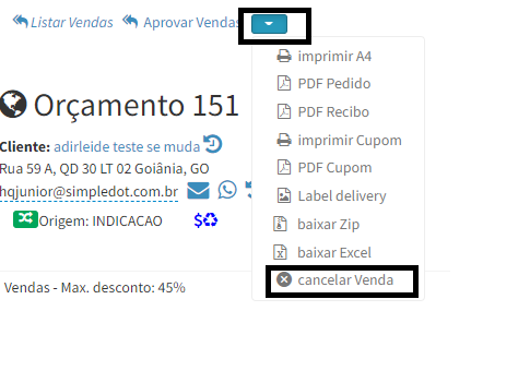 . É possível escolher a forma de ‘Imprimir a venda’ e “Cancelar a venda”.
