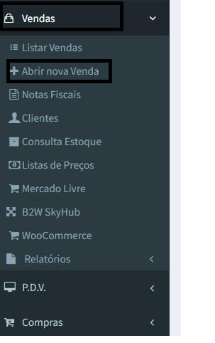 . Na tela inicial, acesse no menu principal Vendas e depois clique em Abrir nova Venda.