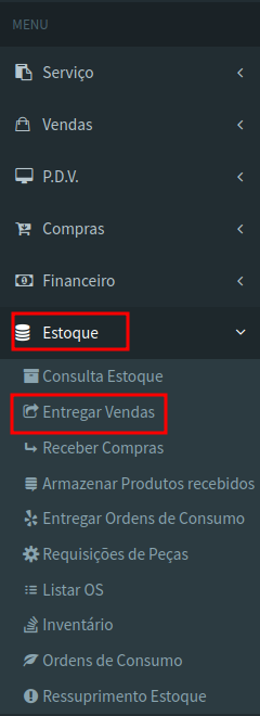 1. Depois de finalizar a venda, retorne ao menu principal em Estoque em seguida em Entregar Vendas.