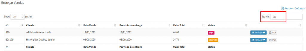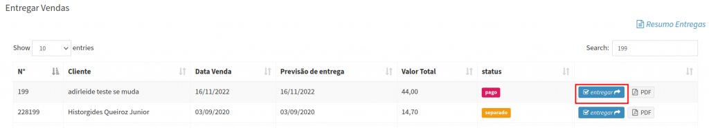 2. Na tela de Entregar vendas, são listados todas as vendas realizadas que falta ser entregue, busque a venda desejada.