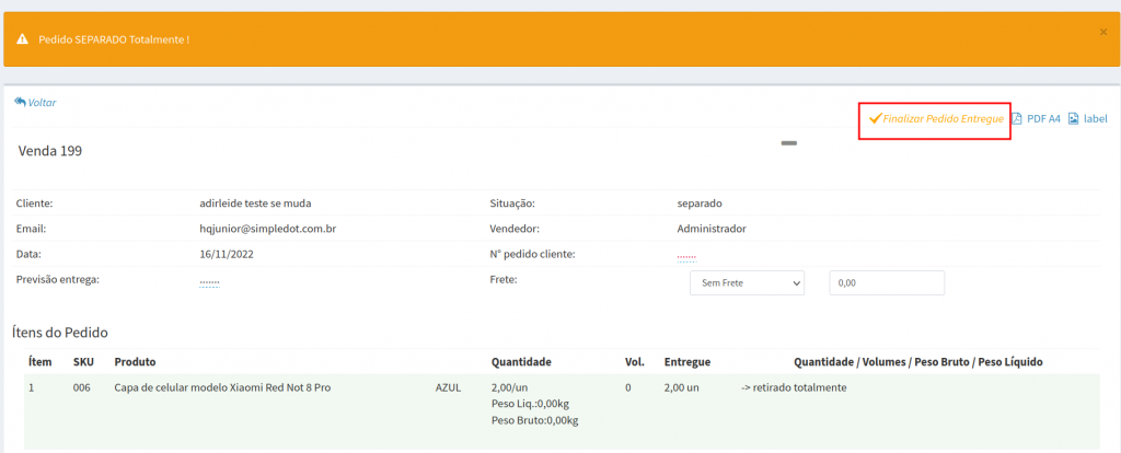 6. Para finalizar o procedimento de entrega, clique na opção Finalizar Pedido Entregue.