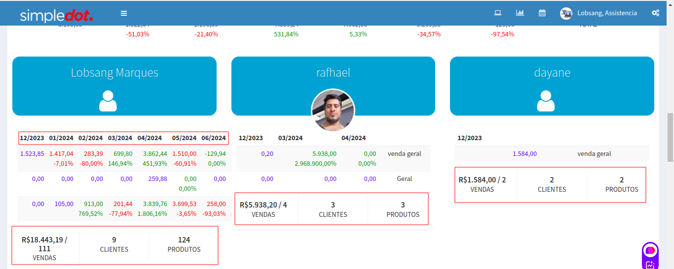 As informações de cada vendedor por vendas/clientes e por produtos também semestral.