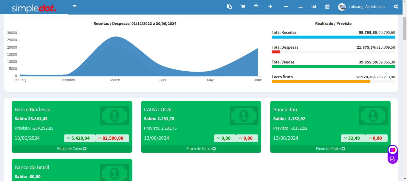 Dados de Receitas,Despesas,gráficos.Valores Realizados/Previsto/Total de Receitas/Total de Despesas/Total de Vendas e Lucro Bruto, transferências bancarias.