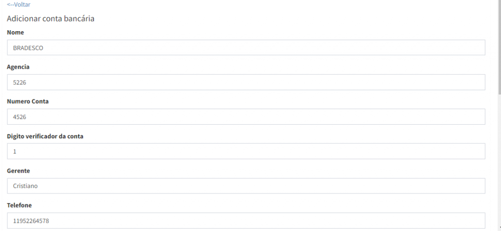 É possível adicionar os dados do gerente da conta como: Nome, Telefone e E-mail;
