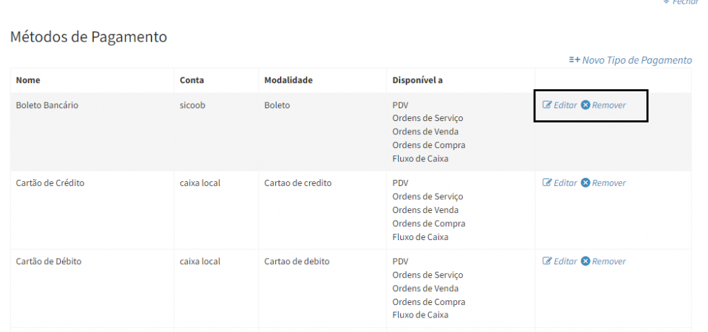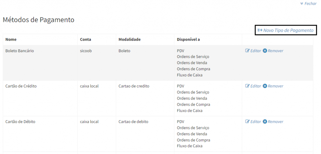 Para criar uma nova forma de pagamento clique na opção ‘Novo tipo de pagamento‘.