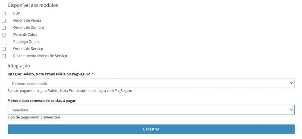 5. Em Disponível aos módulos, marca em qual módulos esta forma de pagamento estará disponível;