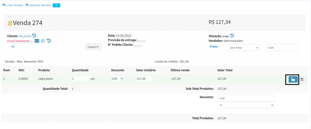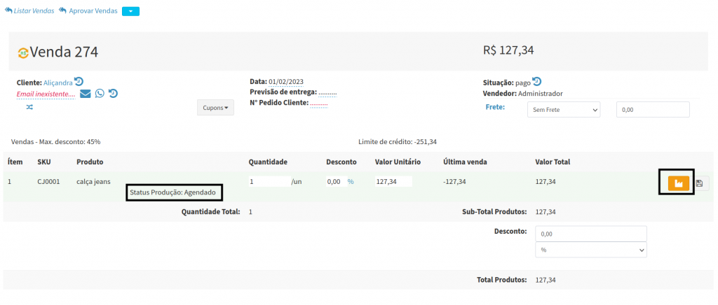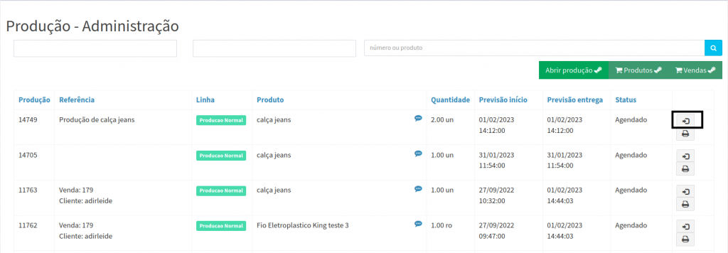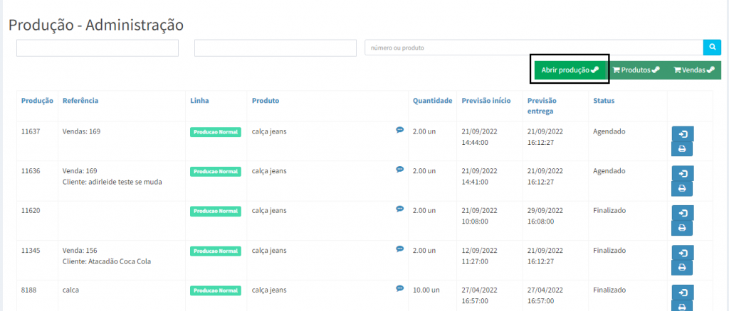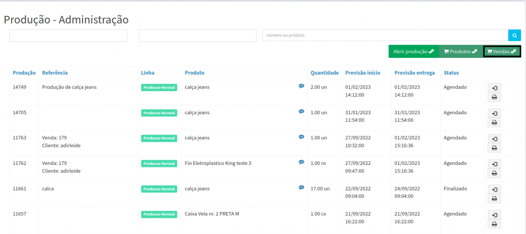 7. Você será redirecionado para tela de Vendas, onde ira clicar no ícone de produção, para está agendando a produção do produto.