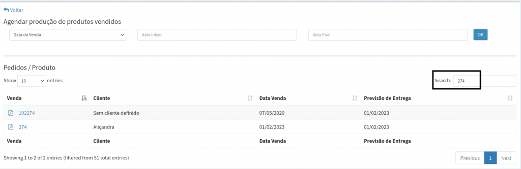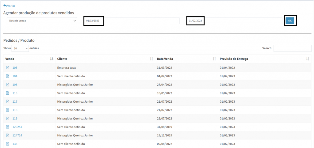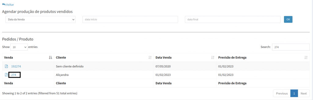 6. Em seguida, clique sobre o número da venda que deseja agendar produção.