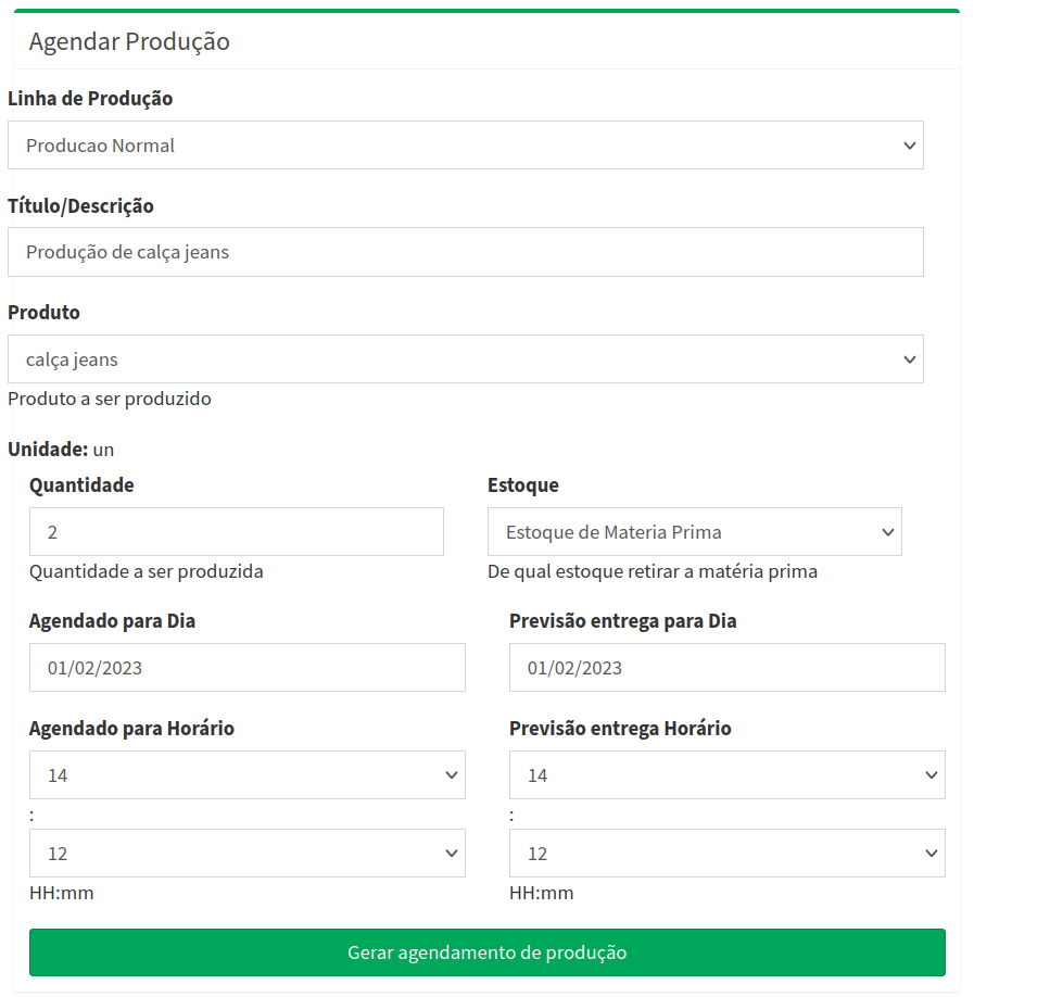 Após todos os campos preenchidos, clique em Gerar agendamento de Produção.