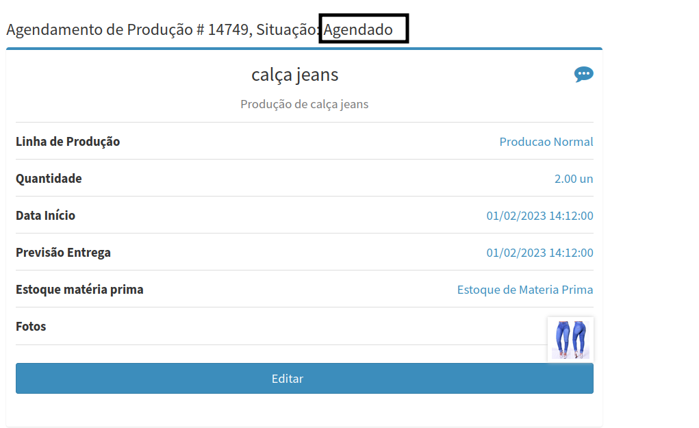 10. Após o agendamento da produção ser realizado o sistema altera a cor do ícone de agendamento de produção e altera o status para Agendado.