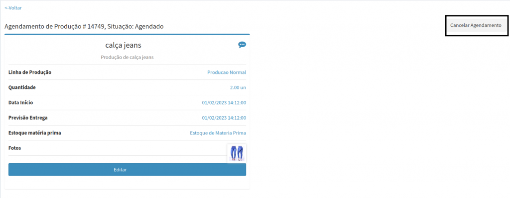 6. Caso queira cancelar o agendamento, na tela de Produção aonde esta listado todas as produções, procure o agendamento cadastrado e clique no ícone localizado no canto direito da tela, o sistema vai abri a tela de agendamento depois clique em Cancelar Agendamento.