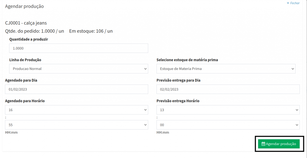 4. Em seguida o sistema vai te direcionar para tela de Agendar Produção, onde deve ser preenchido os campos solicitados.