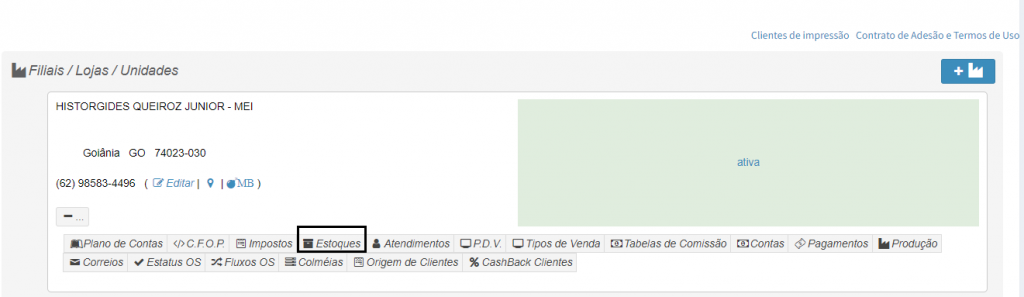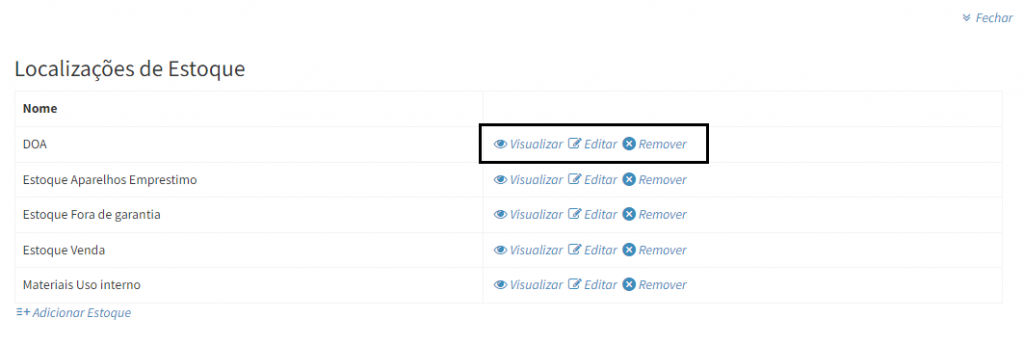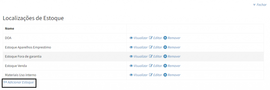 Para criar um novo estoque, clique na opção Adicionar Estoque.
