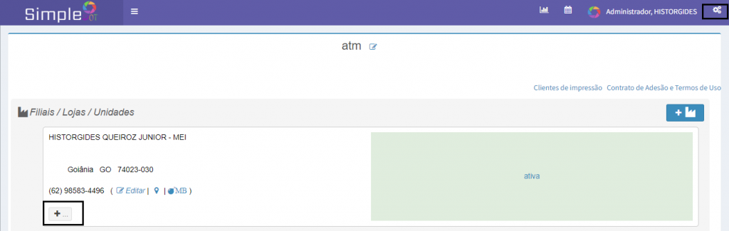 - No canto superior direito na engrenagem, em seguida clique no ícone com sinal de + para abrir o menu configuração da empresa.