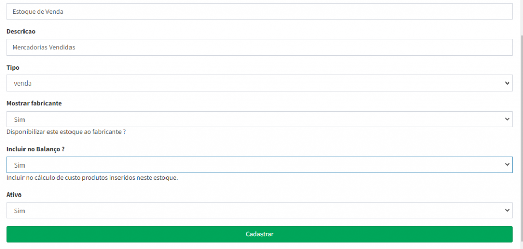 4. O sistema ira te redirecionar para tela de Cadastro de Estoque, onde você de preencher as informações.