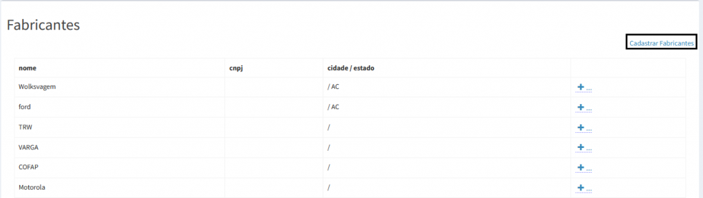 - 3. Na tela ‘Fabricantes’, são exibidos os fabricantes já cadastrados. Para adicionar um novo fabricante, clique em “Cadastrar fabricantes”.
