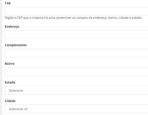 - Informe o CEP do endereço. Ao informar o CEP os campos endereço, bairro, cidade e Estado serão preenchidos automaticamente.