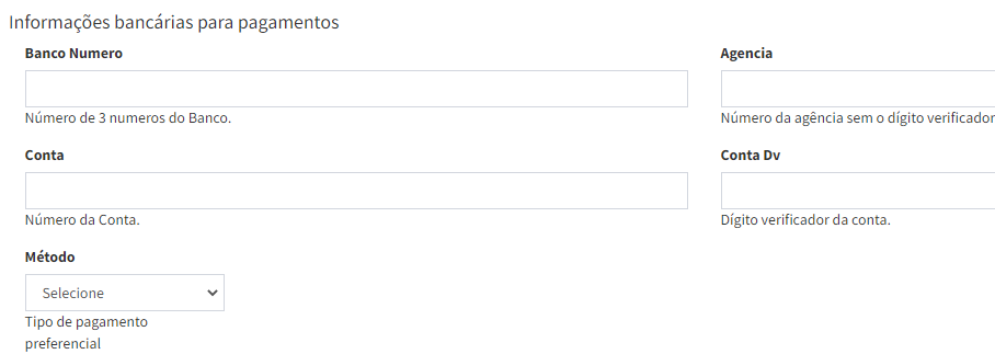 - Informe o número do banco, agencia, conta, digito da conta e método para escolher um tipo de pagamento preferencial.