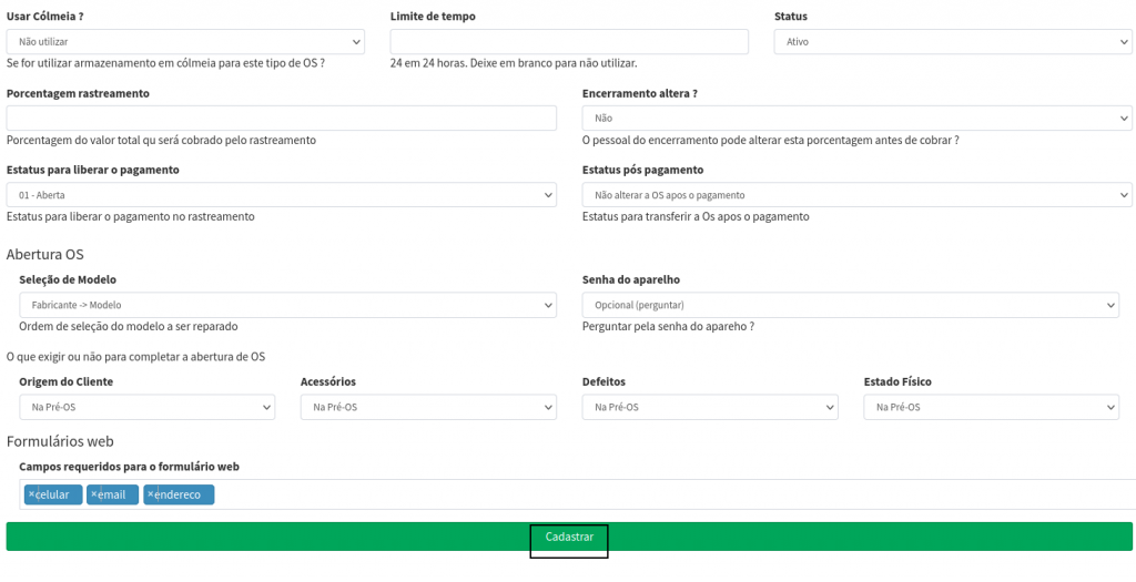 Estado Físico: Selecionar se deseja exigir o estado físico do aparelho