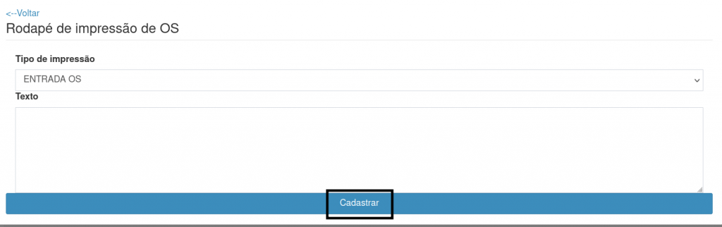 No campo Texto,informe o texto que vai aparecer no rodapé de impressão da ordem de serviço.