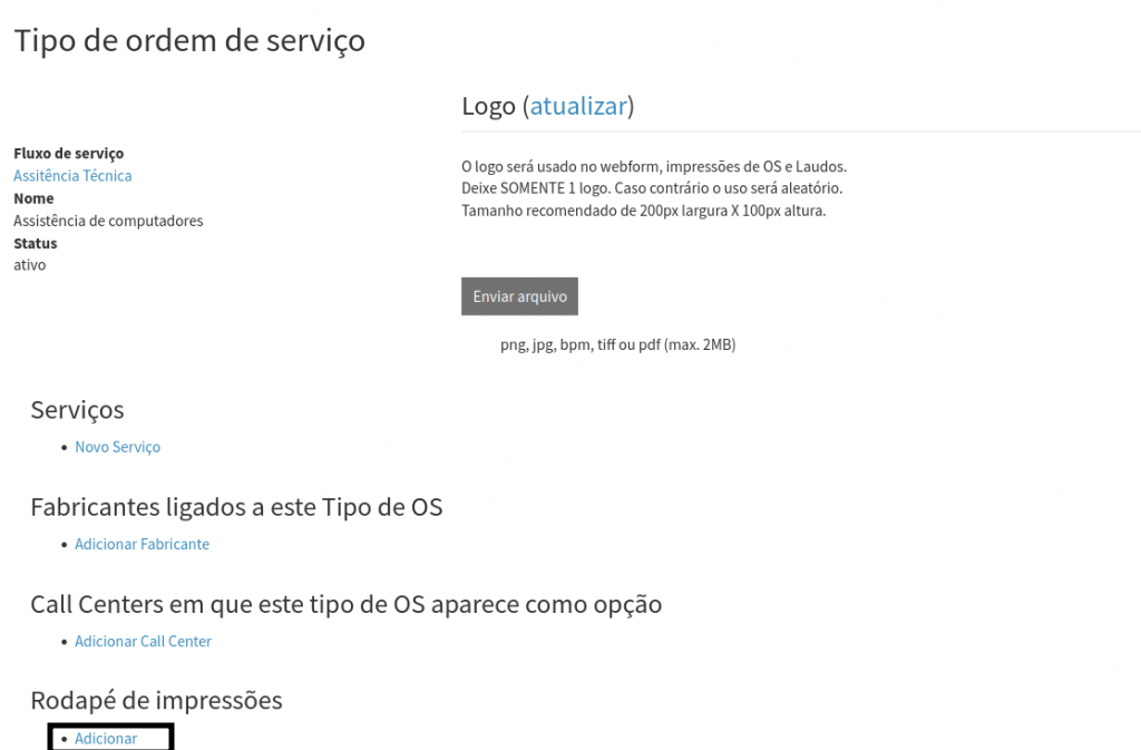 Em Rodapé de impressão, configure o rodapé de impressão para ordem de serviço, clicando em Adicionar