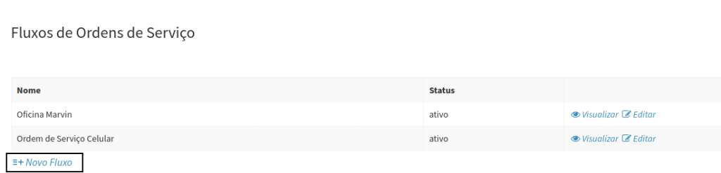 3. Você será direcionado para tela de fluxo de ordem de serviços, onde são listados os tipos de fluxo de ordem de serviço cadastrados. Para cadastrar um novo clique em Novo fluxo.