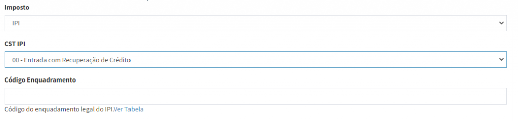6. No campo Imposto ao selecionar a opção IPI o sistema exibe as opção que será cobrada sobre esse imposto para ser preenchidas.