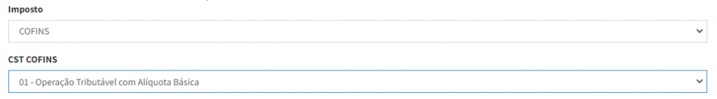 8. No campo Imposto ao selecionar a opção COFINS o sistema exibe a opção para ser preenchida a respeito deste imposto.
