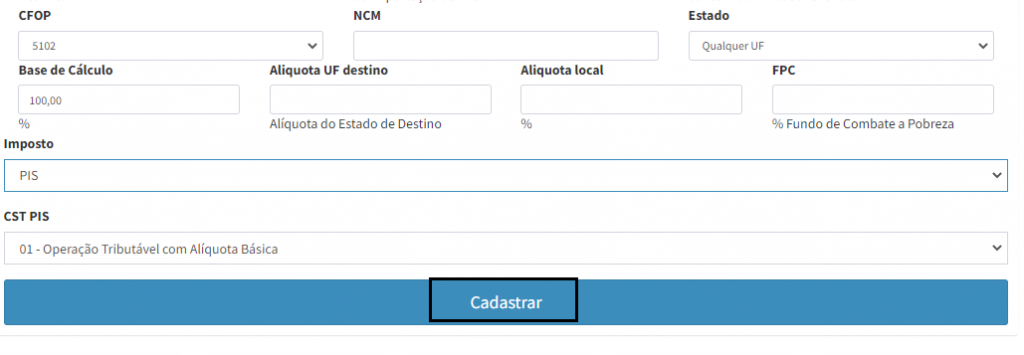 10. Após preencher as informações de acordo com tributação da empresa, clique em cadastrar.