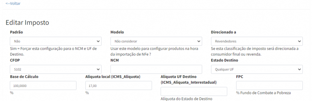 No campo padrão, selecione se esta tributação será padrão de todos os produtos;