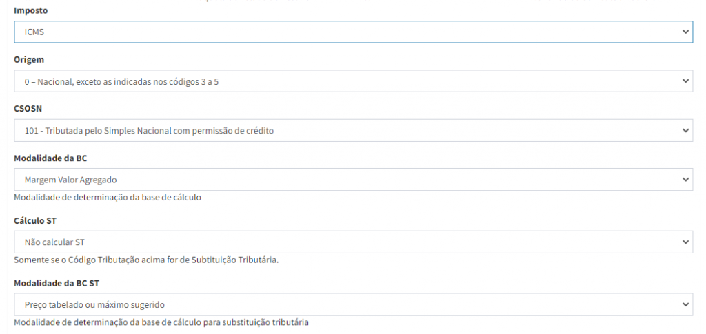 5. No campo Imposto ao selecionar a opção ICMS o sistema exibe as opção para ser preenchidas a respeito deste imposto.
