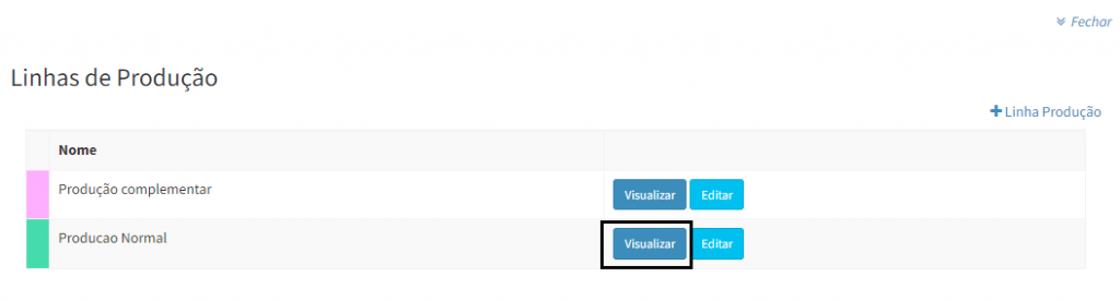 5. Após cadastrar a linha de produção, você ira cadastrar os processos que complementa esta linha de produção, clicando na opção Visualizar da linha de produção que foi cadastrado.