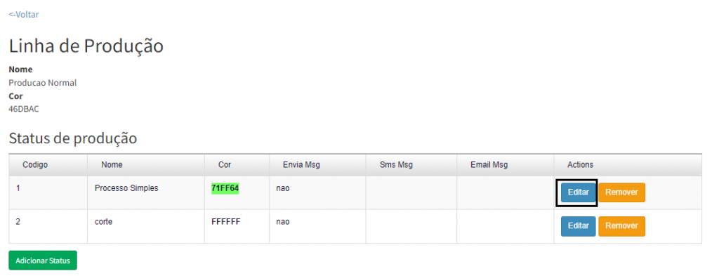 9. O sistema ira te redirecionar para pagina Linha de Produção, onde está cadastrado os Status da produção, para alterar alguma é só clicar em Editar.