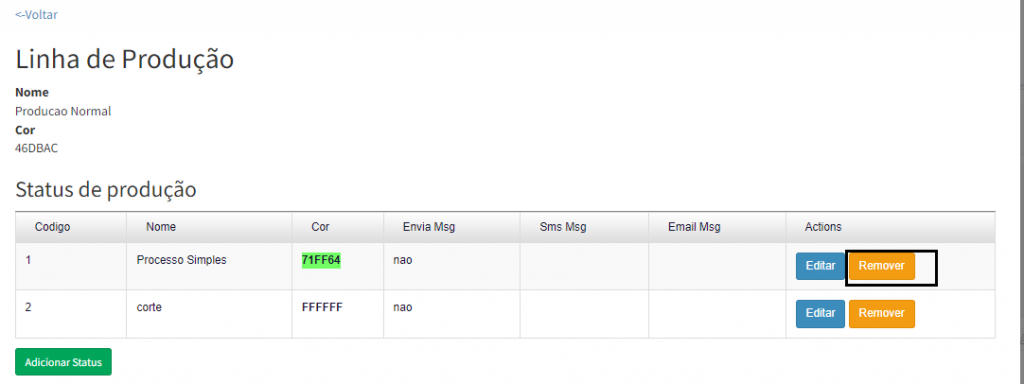 10. Caso queira excluir o Status da linha de produção, só clicar em Remover.