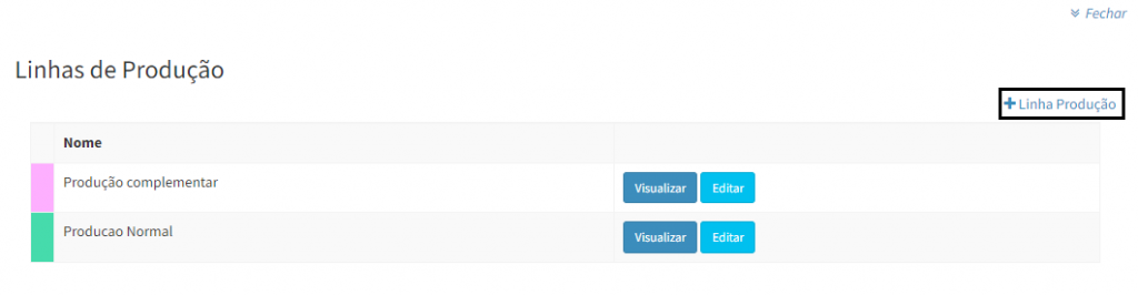 3. Você será direcionado para tela de Linhas de Produção, será exibido as linhas de produção já cadastrado. Para cadastrar uma nova, clique em Linha de Produção.