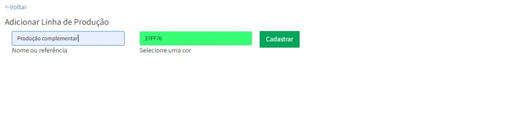 4. O sistema vai exibir a tela para cadastrar o Nome e Cor desta Linha de Produção, após preencher os campos solicitados, clique em Cadastrar.
