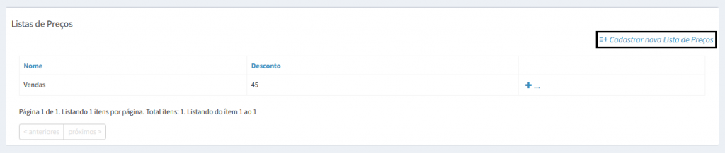 3. Na tela de Listas de Preços, são exibido as listas já cadastradas. Para adicionar uma nova, clique em Cadastrar nova Lista de Preços.