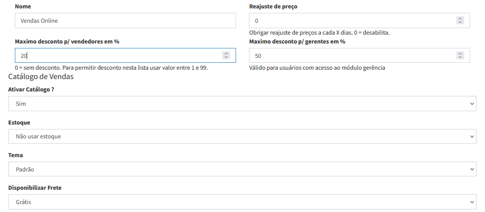 No campo Ativar Catálogo, selecione se está lista ira utilizar o catálogo online;