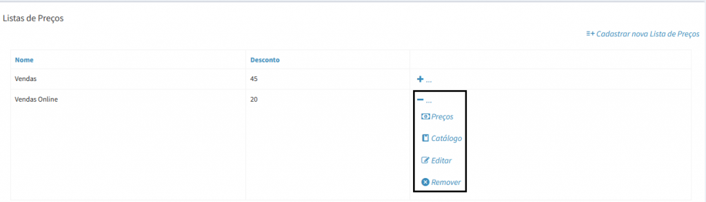 Na tela de Listas de Preços é possível alterar o preço de venda, cadastrar catálogo online, editar ou remover, clicando em uma das opções.