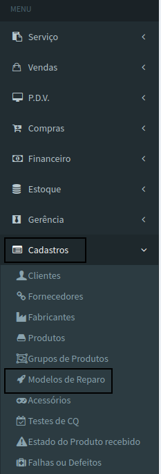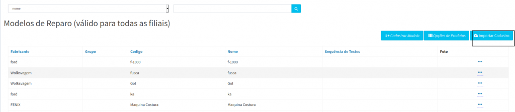 O sistema tem a opção de Importar de uma planinha de Excel o cadastro de modelos de reparos para o sistema, clicando em Importar Cadastro.