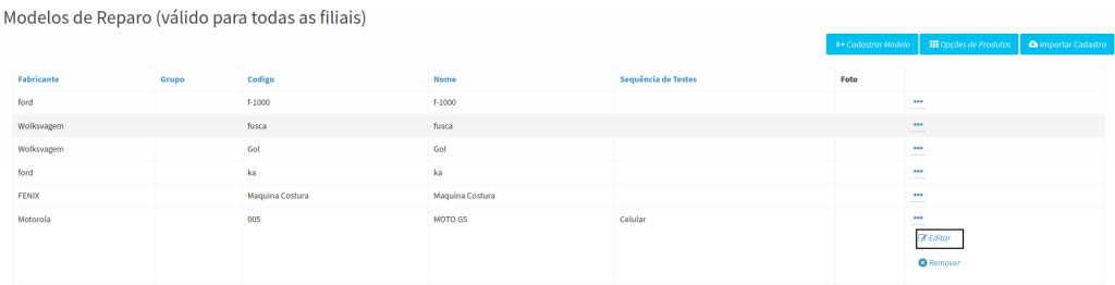 - Para inserir Grade/ Variação em Modelos de Reparos, retorne a tela de listagem de modelos de reparo e busque o produto desejado, em seguida clique em Editar.