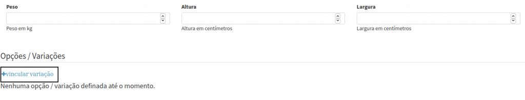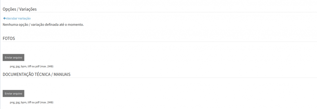 5. Após realizar o cadastro o sistema exibe as opções de colocar Variações, Fotos e Manuais.
