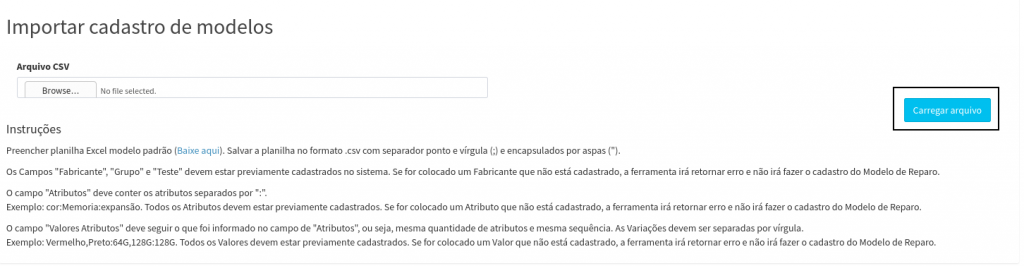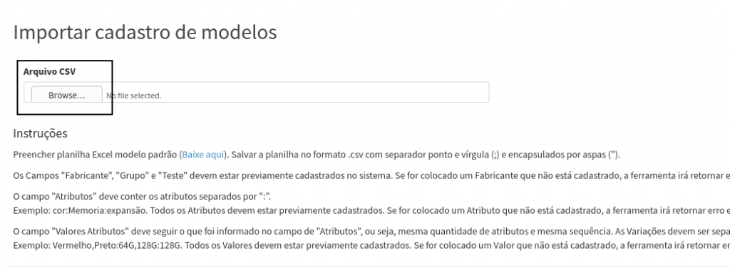Na tela de Importar cadastro de modelos, siga as instruções do sistema, em seguida busque o arquivo salvo no computador.