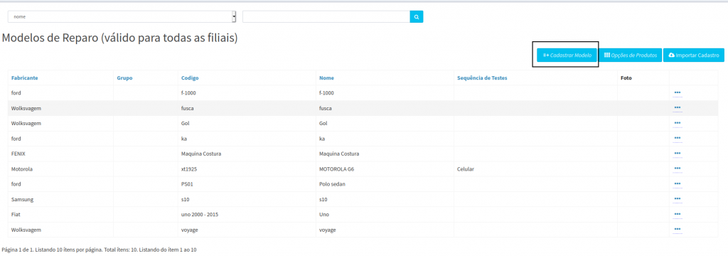 3. Na tela de Modelos de Reparo, são listados os modelos de reparo cadastrados. Para adicionar um novo clique em Cadastrar Modelo.