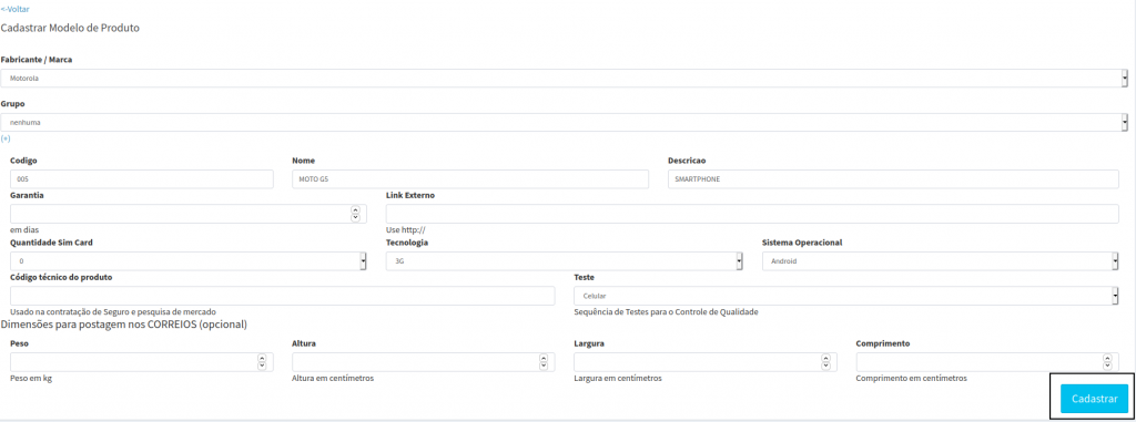 4. Em seguida, você será direcionado para tela de Cadastrar Modelo de Produto, onde será necessário o preenchimento de algumas informações.