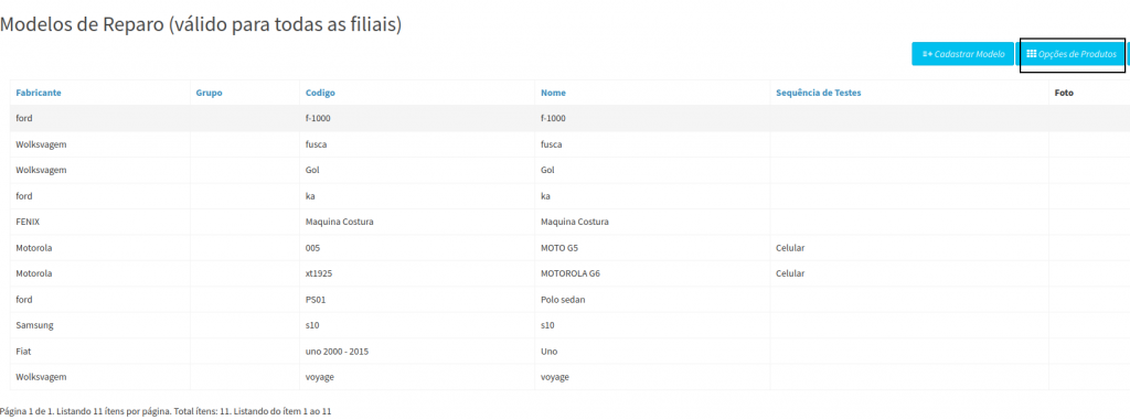 - Retorne a tela de Modelos de Reparos e clique em Opções de Produtos.
