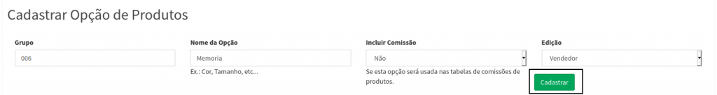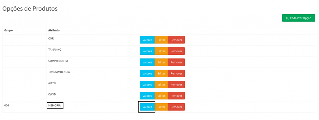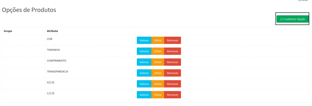 2. Você será direcionado para tela de Opções de Produto, onde são listados as opções de produto já cadastrados. Para cadastrar um novo clique em Cadastrar Opção.