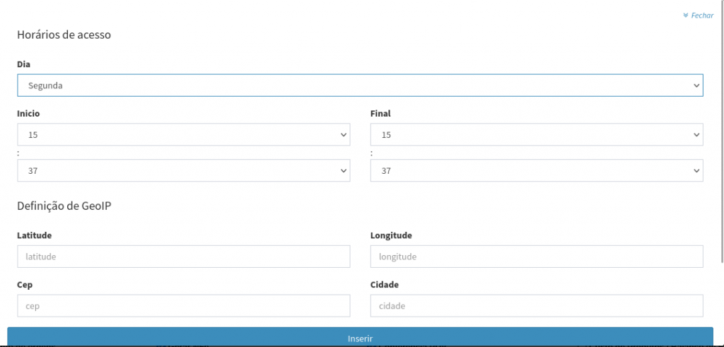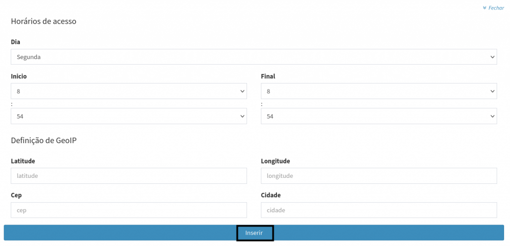 5- Informe o dia da semana, o horário inicial e horário final que o usuário pode acessar o sistema. Após cadastrar os dados, clique em inserir.