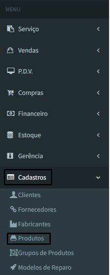 1. Para cadastrar a Ficha Técnica de um produto de produção no sistema, acesse o Menu Principal que se encontra ao lado esquerdo da tela e selecione a opção Cadastros.