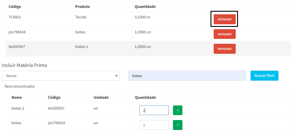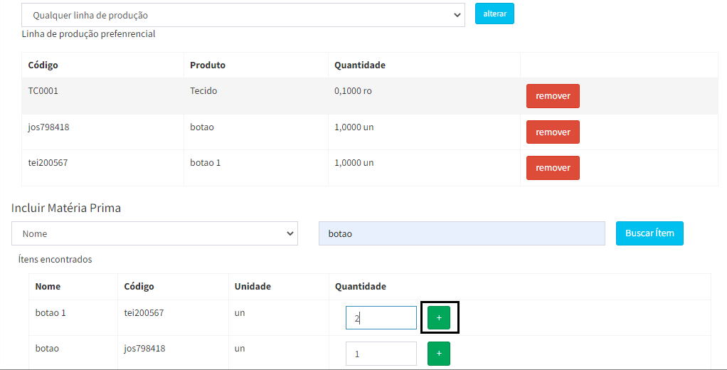 8. Após o sistema busca o item, você vai colocar a quantidade necessária de matéria prima que vai ser utilizada para produção do produto, depois clique no botão verde com sinal de + para adicionar.